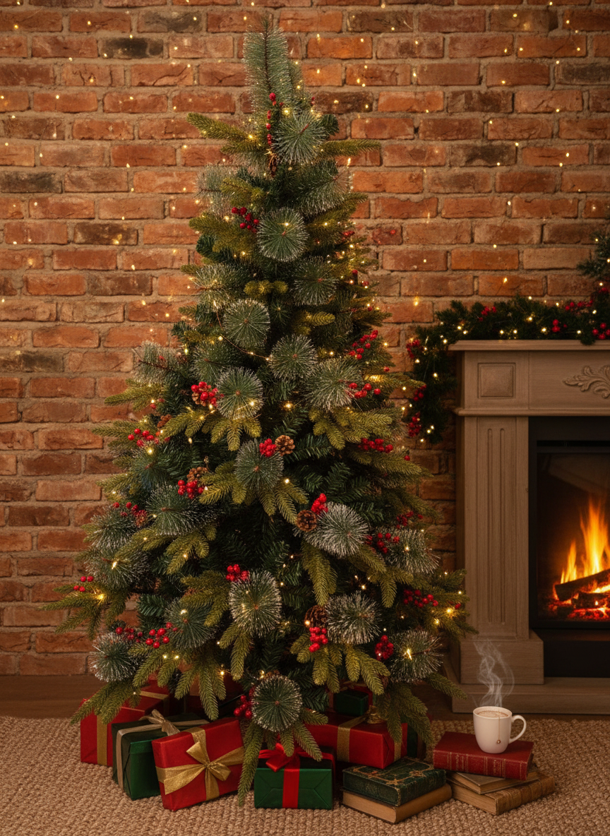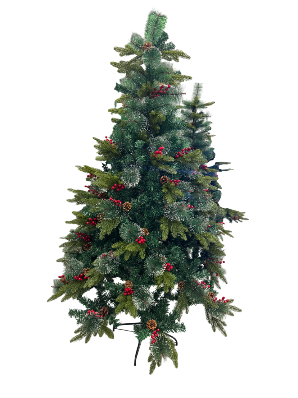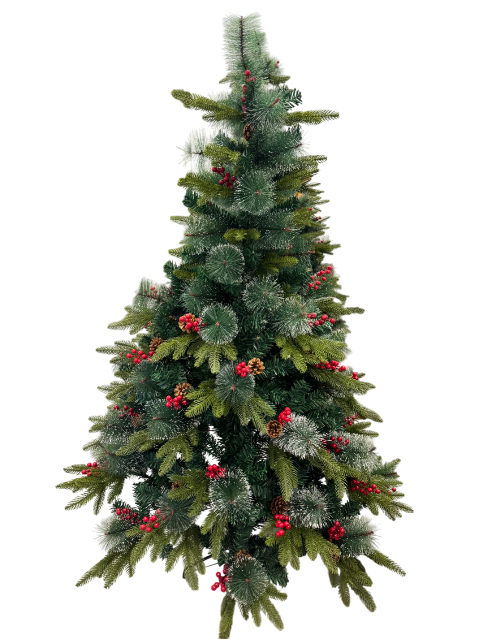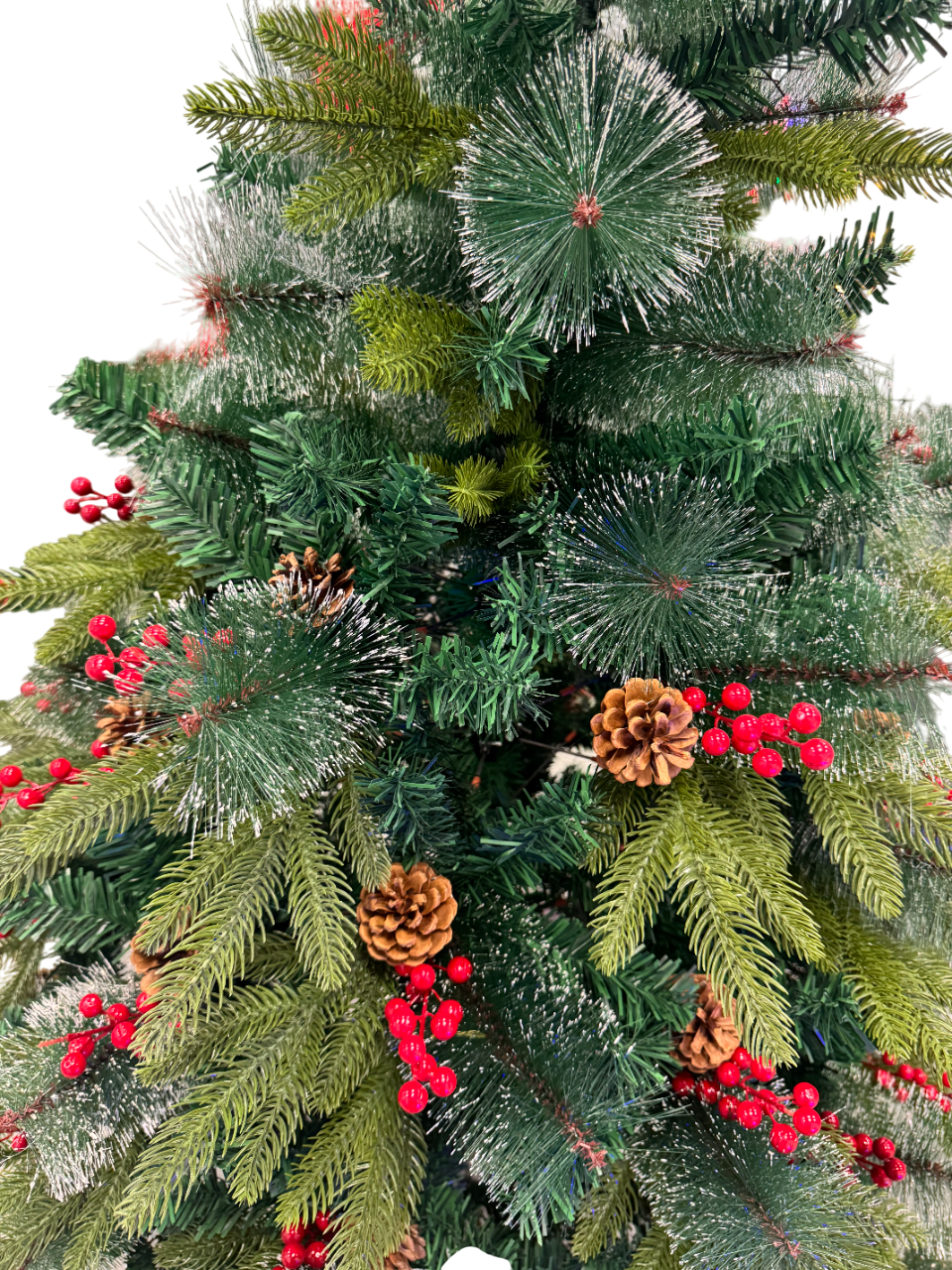 Unesite prazničnu čaroliju u svoj dom uz novogodišnju jelku Winter Harmony Deluxe – jedinstveni hibrid koji kombinuje različite vrste grana, gustinu i dekoraciju sa crvenim bobicama i šišarkama.