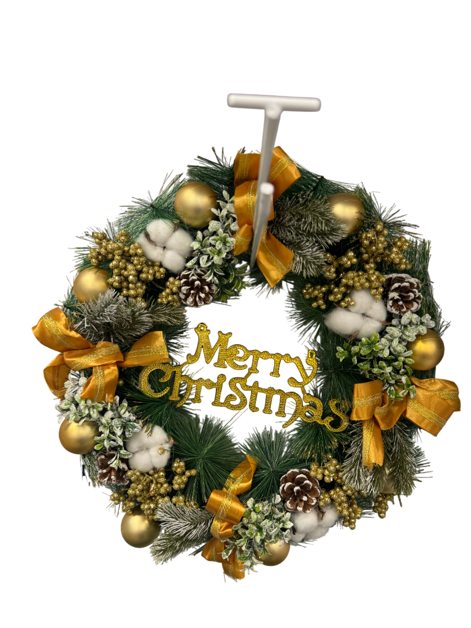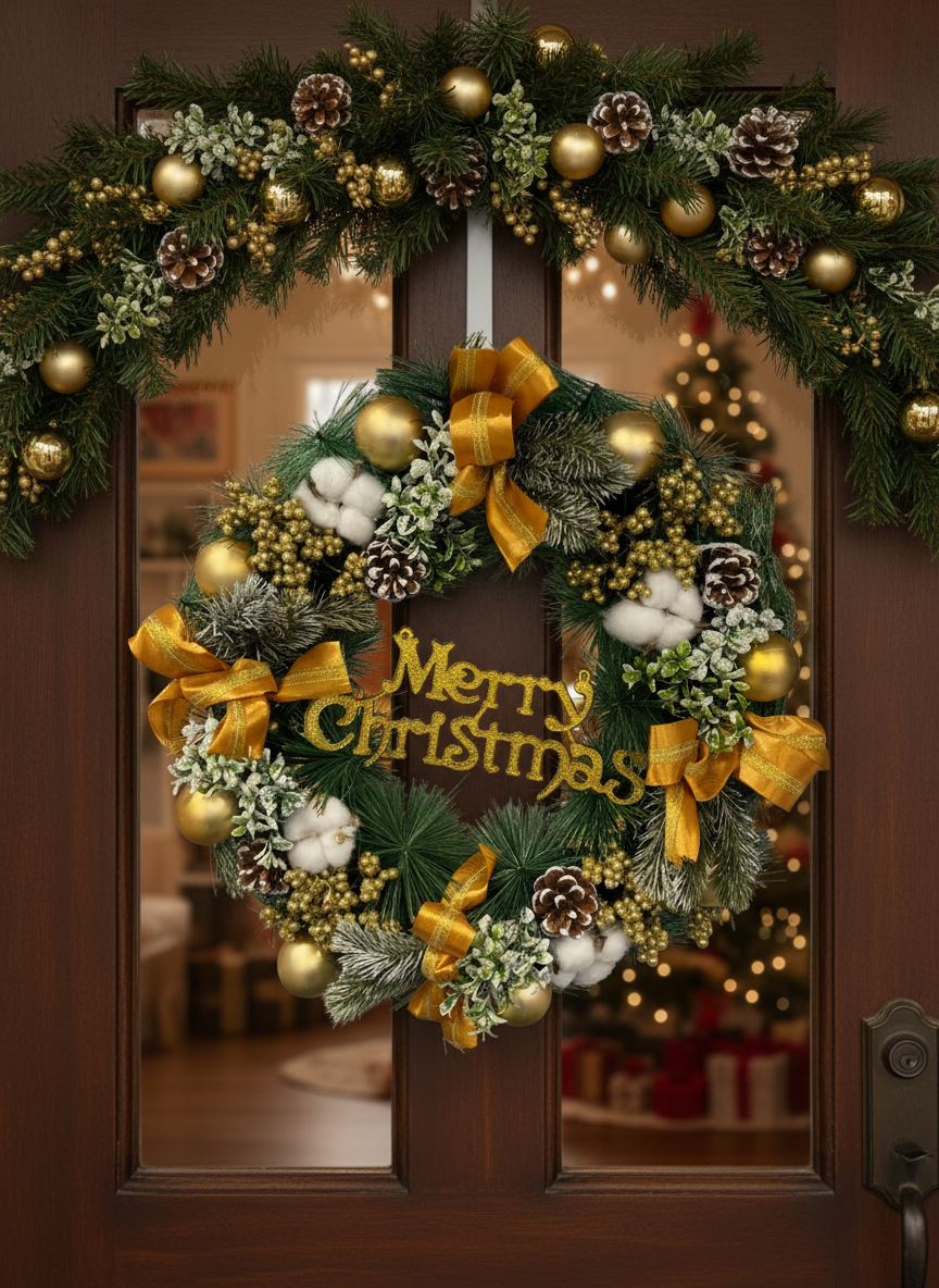 🎄 Golden Celebration – luksuzan, dekorativan venac sa zlatnim detaljima i prazničnim natpisom za elegantan praznični dom.