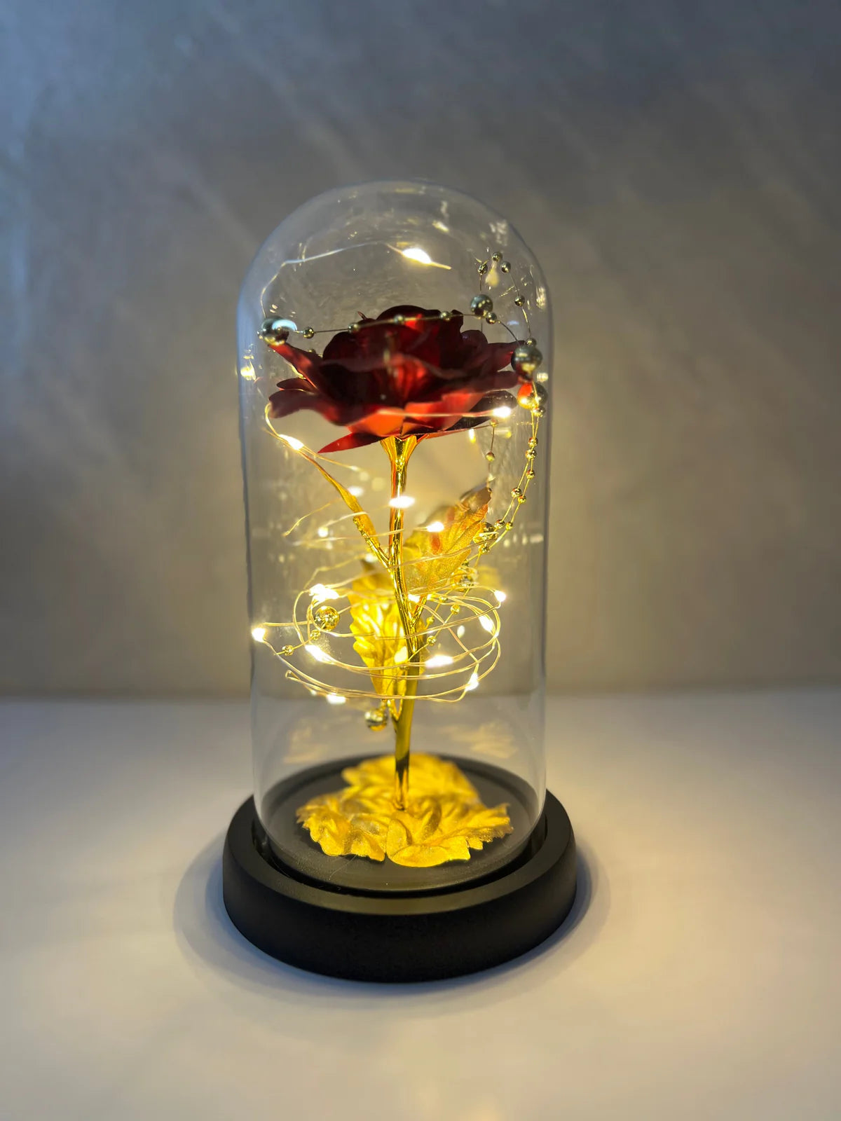 Ruža u staklu je crvene boje i osvetljena LED svetlima koja dodaju toplu svetlost i glamur prostoru. Savršena je kao dekorativna lampa, ali i kao simbol večne ljubavi.