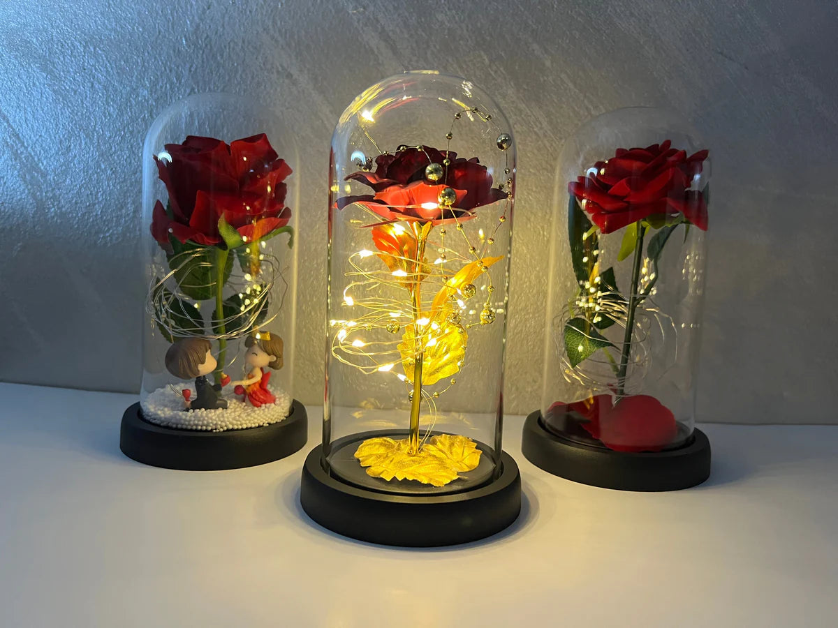 Zlatna svetleća ruža u staklenom zvonu - romantični poklon za svaku priliku